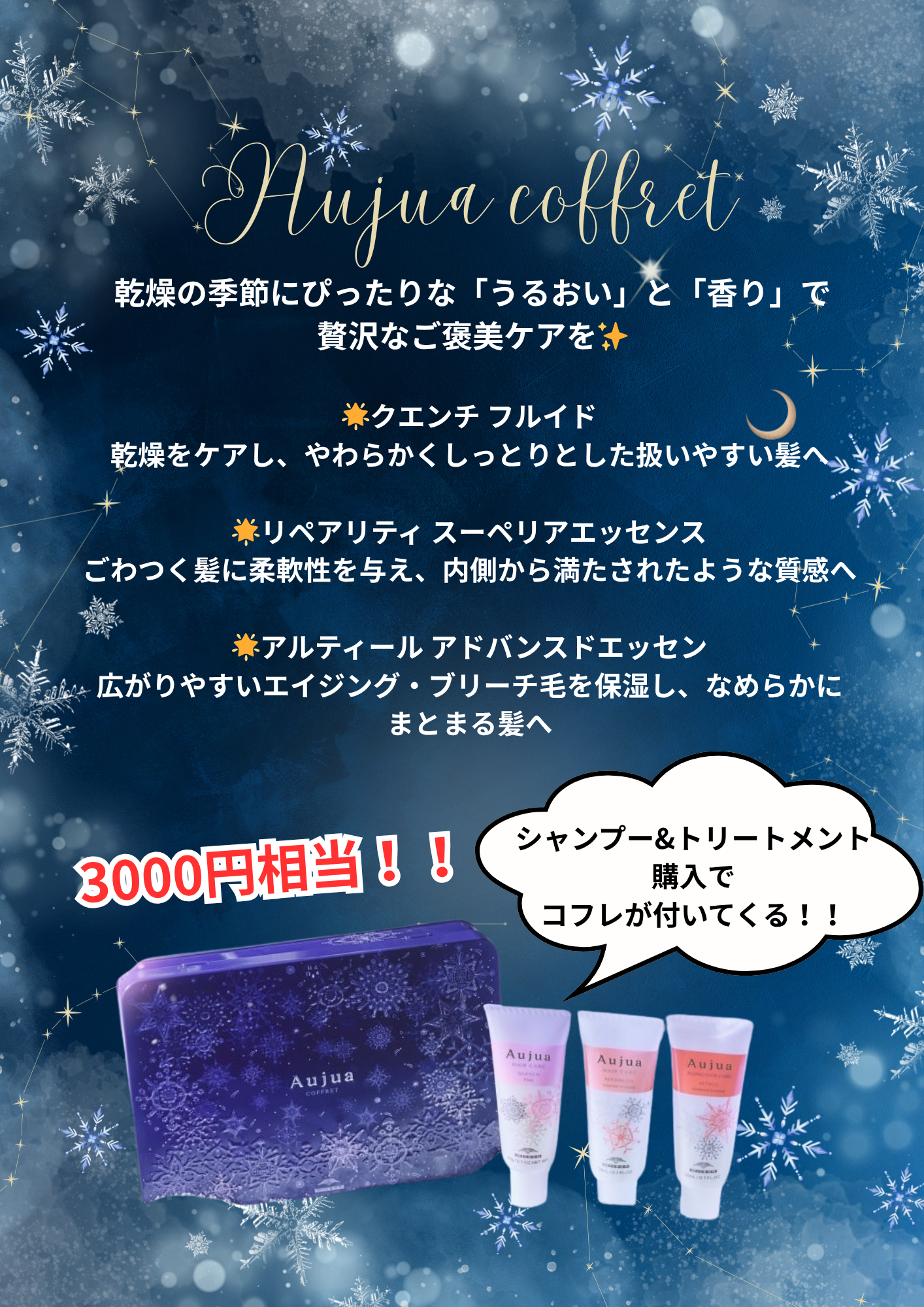 こんにちは太田店では11月特定のオージュア商品を購入頂きますとコフレプレゼントがあります。豪華コフレとなっておりますので興味のある方はスタッフまで^ ^
